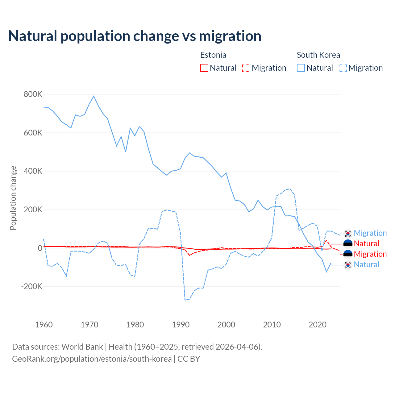 Over the last 10 years, 26.1% of the population change in Estonia is from natural causes (a loss of 27,683 people) and 73.9% is from migration (a gain of 78,553 people). In South Korea 17.6% is from natural causes (a gain of 277,215 people) and 82.4% is from migration (a gain of 1,298,356 people).
