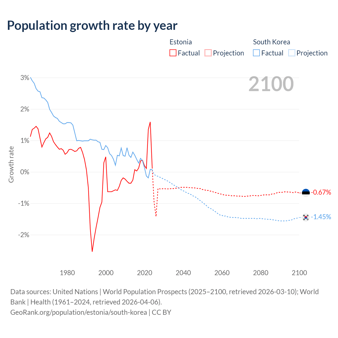 - For the last 10 years, Estonia has had an average growth rate of +0.37% per year vs +0.24% in South Korea.