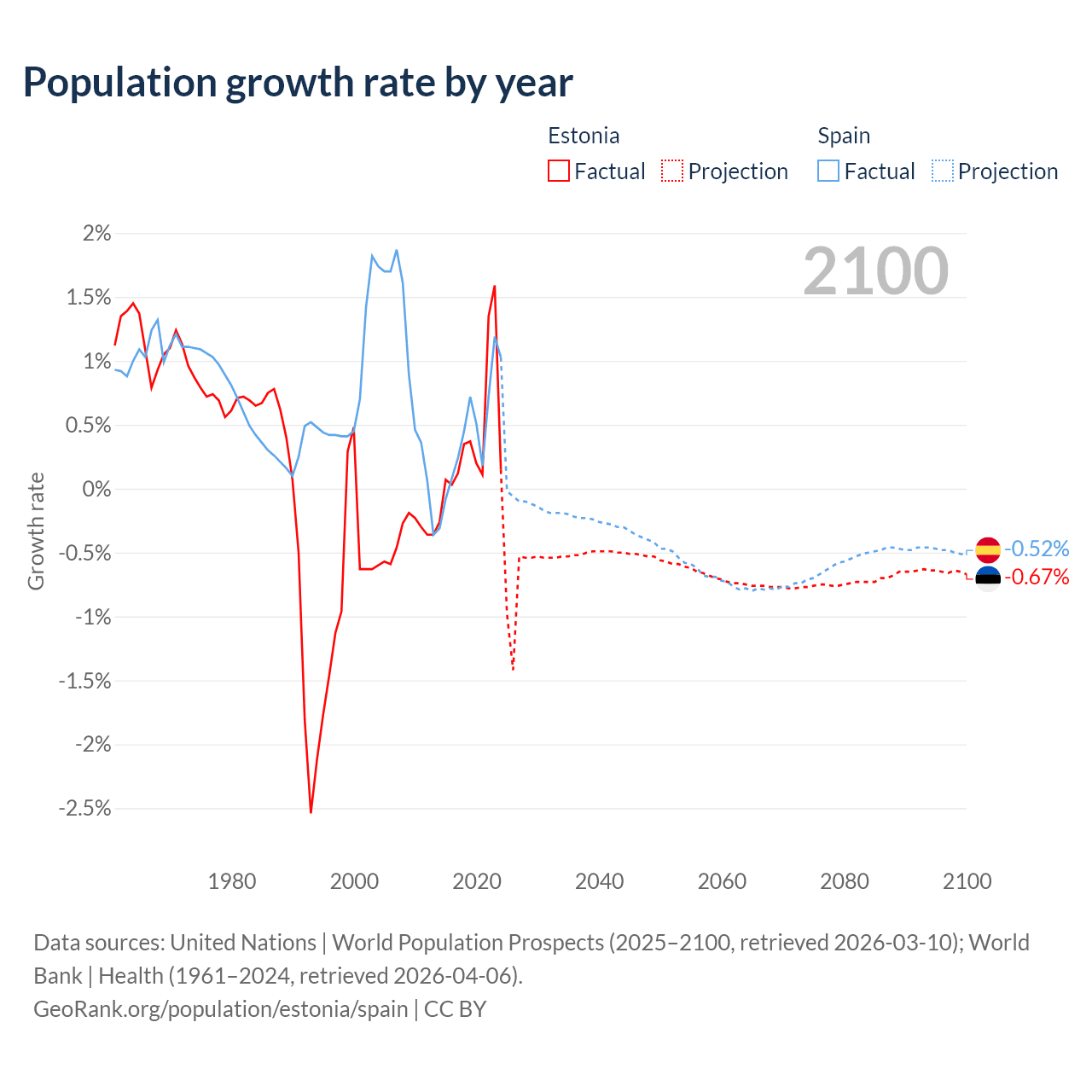 - For the last 10 years, Estonia has had an average growth rate of +0.37% per year vs +0.43% in Spain.