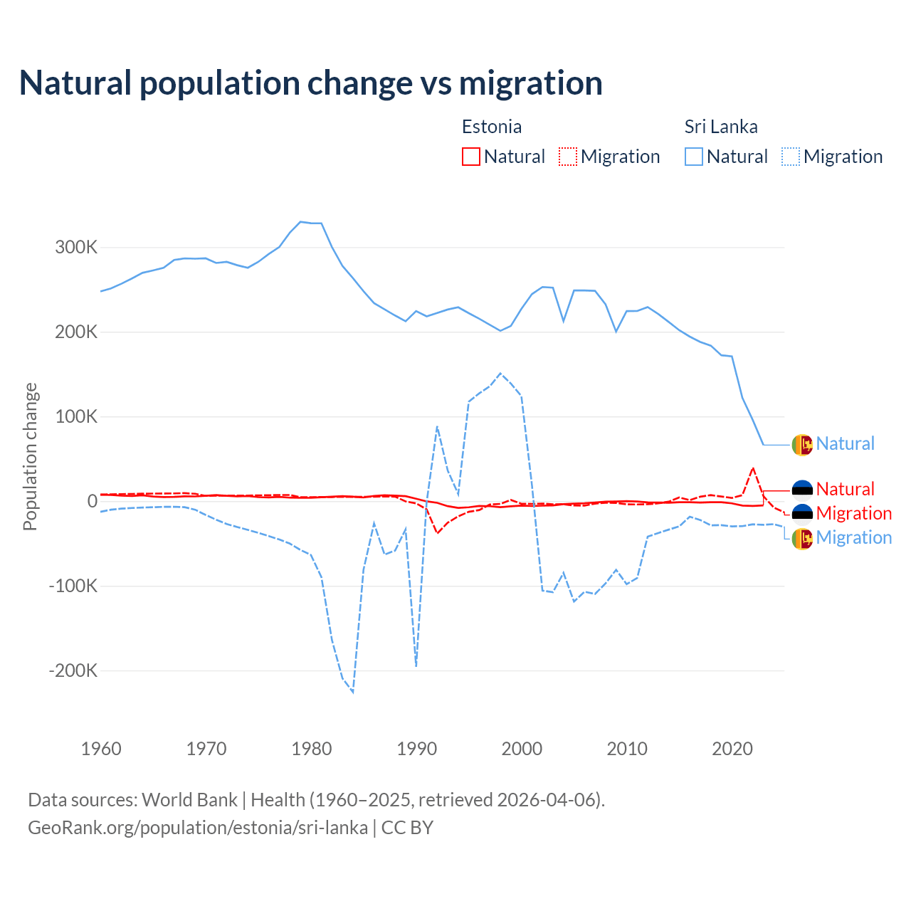 Over the last 10 years, 26.1% of the population change in Estonia is from natural causes (a loss of 27,683 people) and 73.9% is from migration (a gain of 78,553 people). In Sri Lanka 85.3% is from natural causes (a gain of 1,605,749 people) and 14.7% is from migration (a loss of 276,121 people).