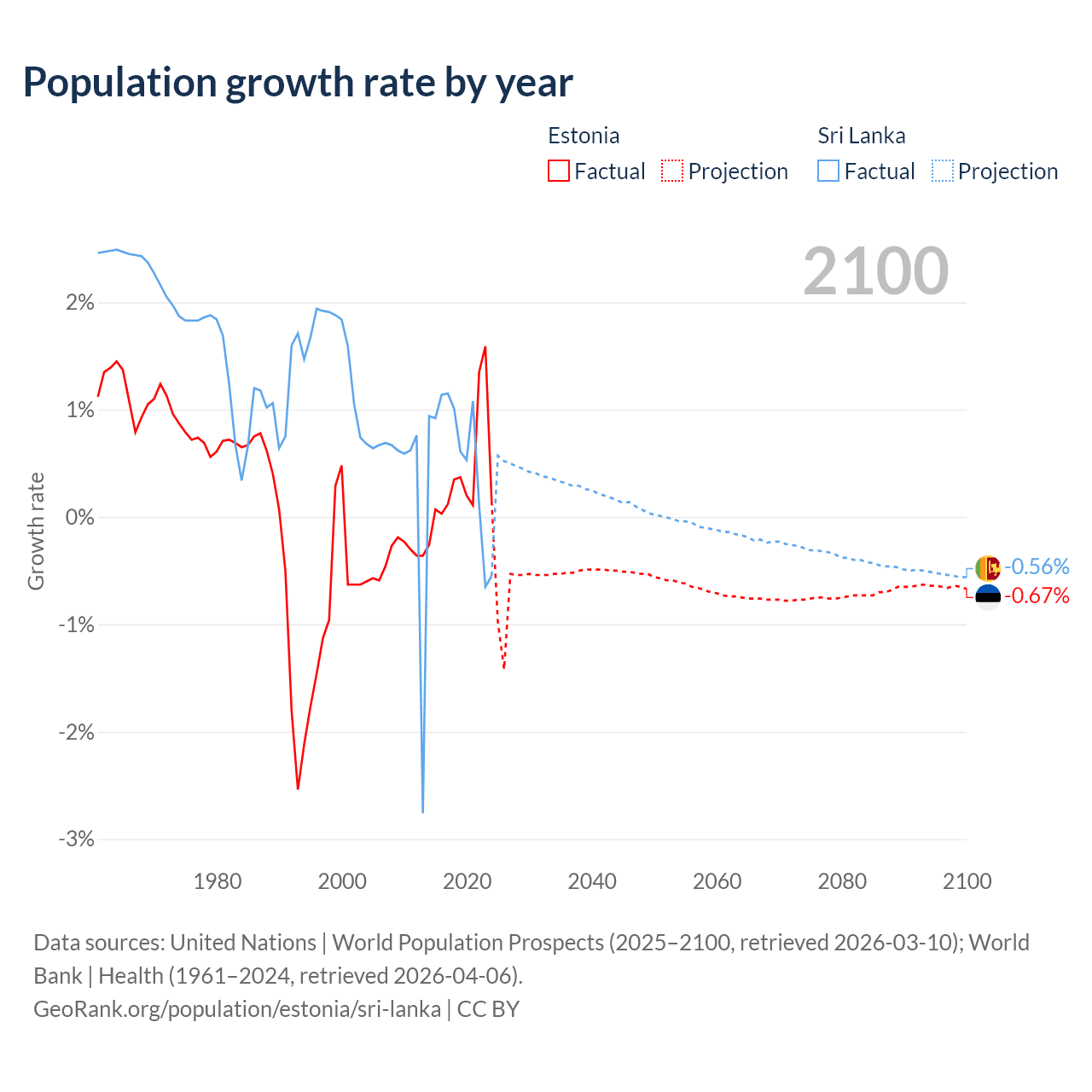 - For the last 10 years, Estonia has had an average growth rate of +0.37% per year vs +0.57% in Sri Lanka.