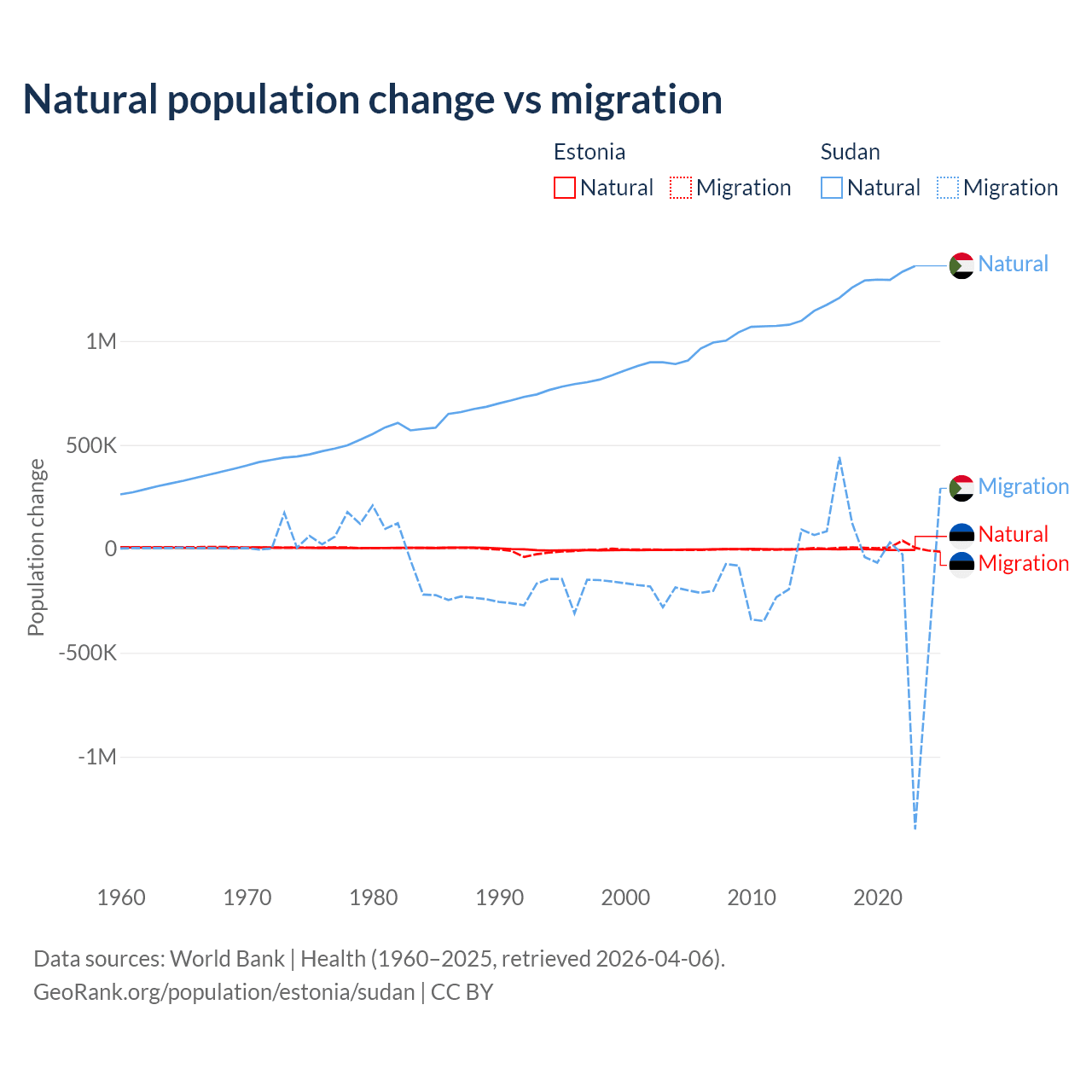Over the last 10 years, 26.1% of the population change in Estonia is from natural causes (a loss of 27,683 people) and 73.9% is from migration (a gain of 78,553 people). In Sudan 95.1% is from natural causes (a gain of 12,459,977 people) and 4.88% is from migration (a loss of 639,596 people).