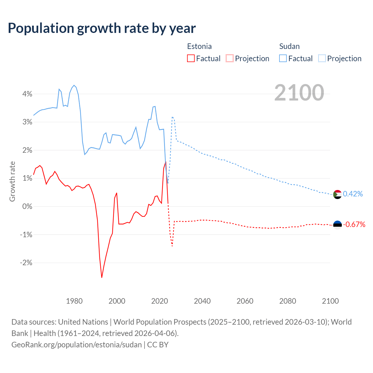 - For the last 10 years, Estonia has had an average growth rate of +0.37% per year vs +2.67% in Sudan.