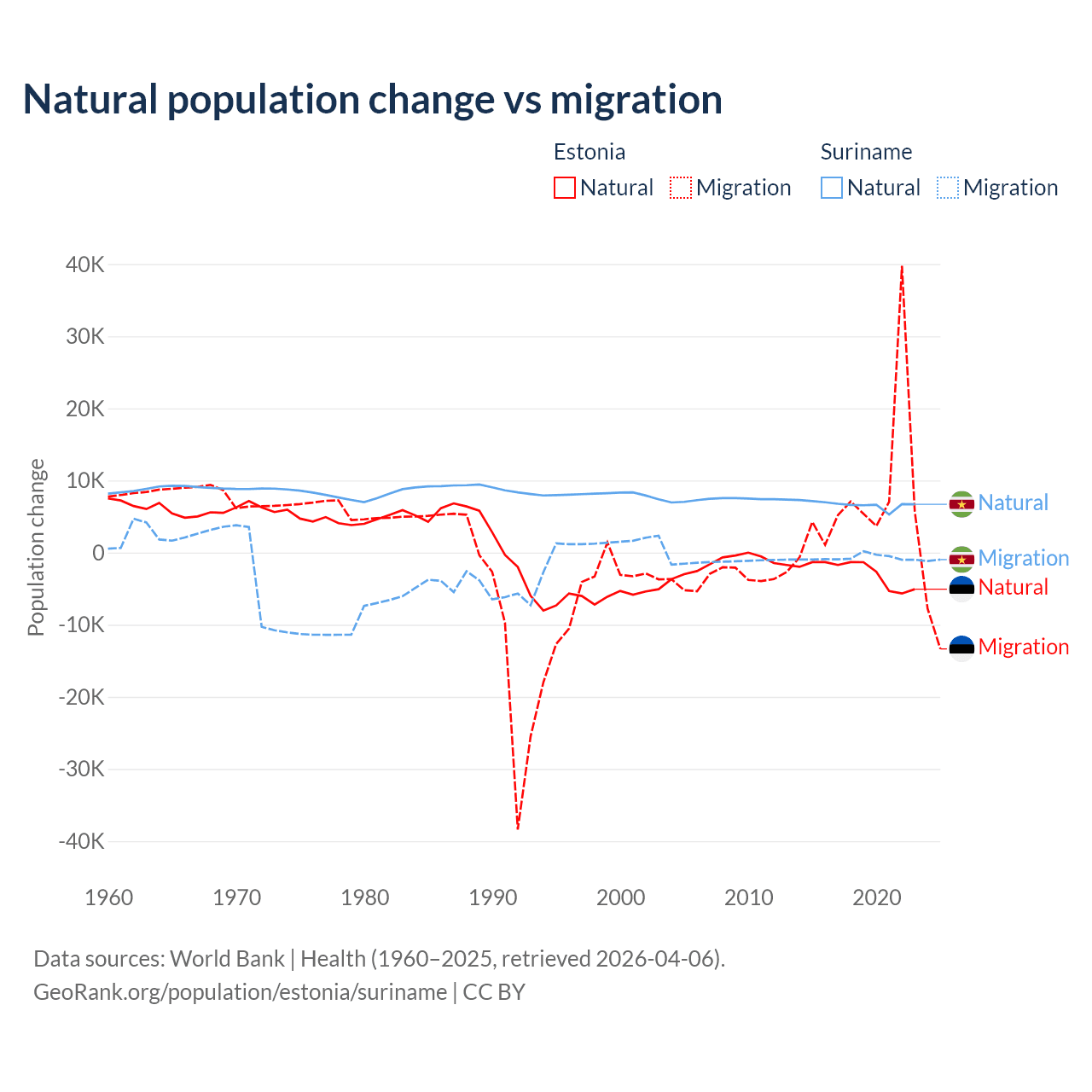 Over the last 10 years, 26.1% of the population change in Estonia is from natural causes (a loss of 27,683 people) and 73.9% is from migration (a gain of 78,553 people). In Suriname 90.3% is from natural causes (a gain of 66,709 people) and 9.72% is from migration (a loss of 7,185 people).
