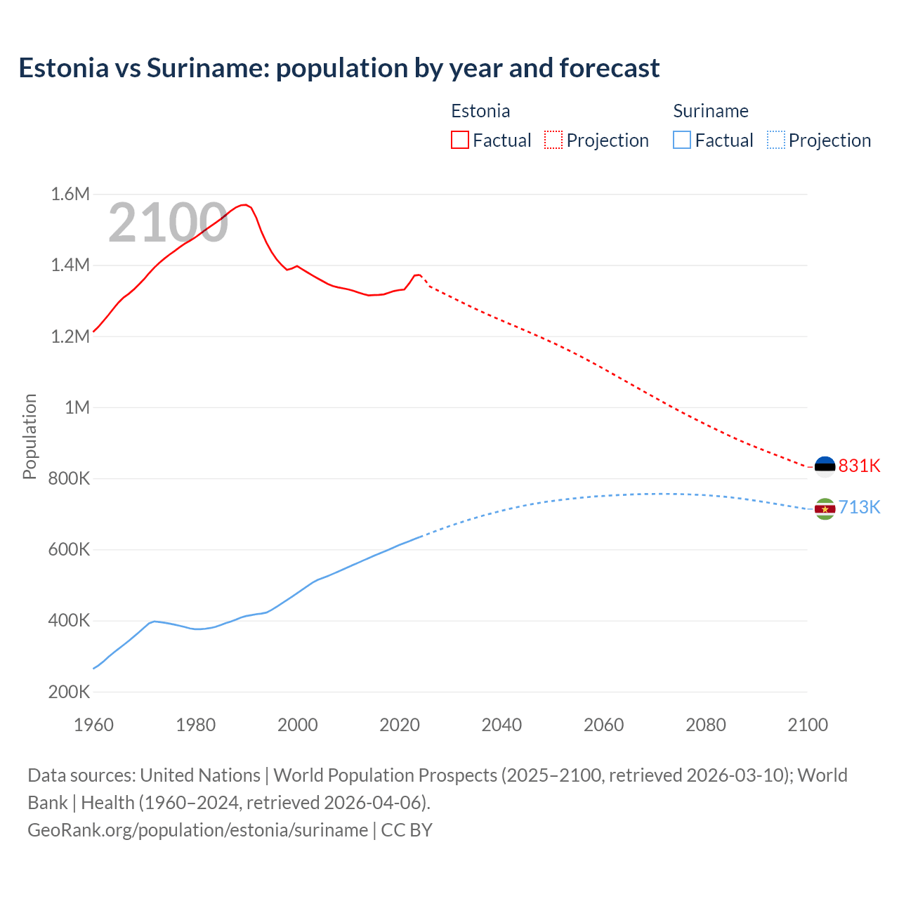 The latest officially reported population of Estonia was 1,372,341 in 2024 vs 634,431 people in Suriname in 2024. In 2026, based on the adjusted UN estimation, the current Estonia's population is 1,339,590 people compared to 646,767 in Suriname.
