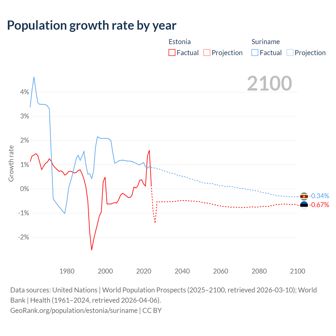 - For the last 10 years, Estonia has had an average growth rate of +0.37% per year vs +0.99% in Suriname.