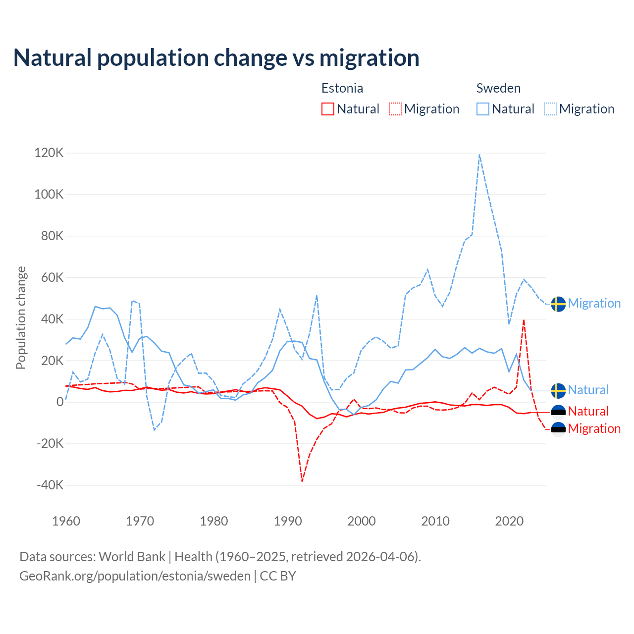 Over the last 10 years, 26.1% of the population change in Estonia is from natural causes (a loss of 27,683 people) and 73.9% is from migration (a gain of 78,553 people). In Sweden 21.4% is from natural causes (a gain of 201,900 people) and 78.6% is from migration (a gain of 743,642 people).