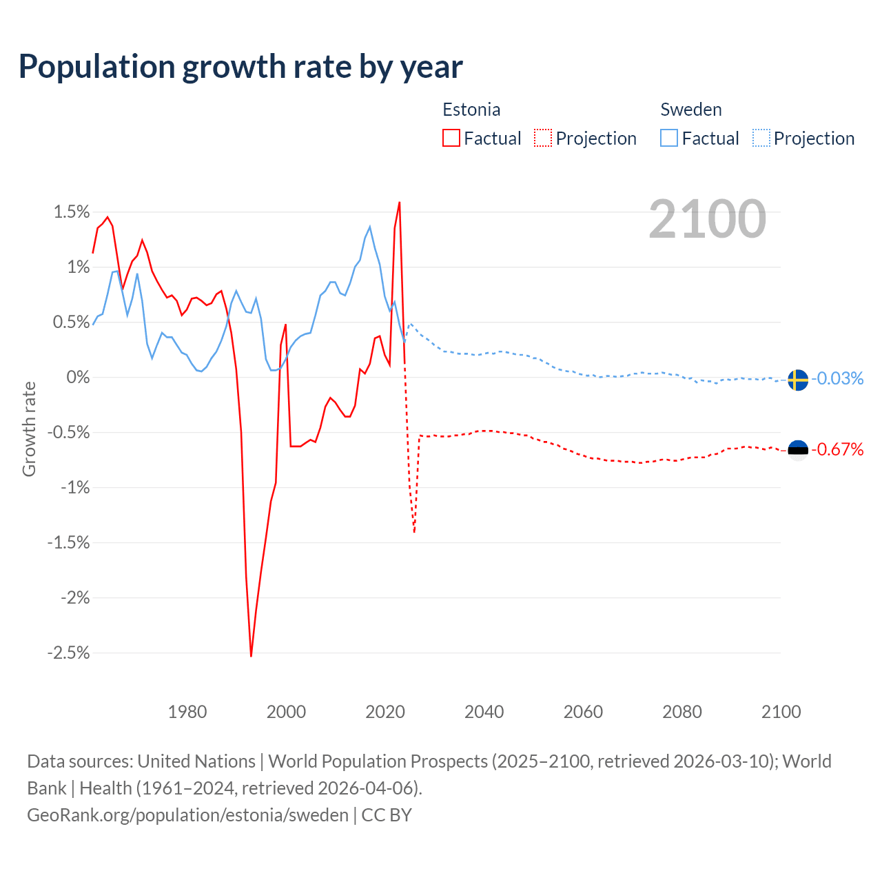 - For the last 10 years, Estonia has had an average growth rate of +0.37% per year vs +0.88% in Sweden.