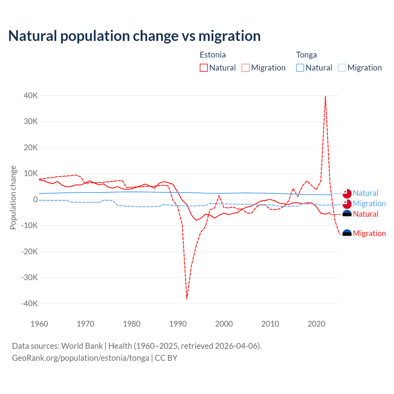 Over the last 10 years, 26.1% of the population change in Estonia is from natural causes (a loss of 27,683 people) and 73.9% is from migration (a gain of 78,553 people). In Tonga 46.9% is from natural causes (a gain of 18,919 people) and 53.1% is from migration (a loss of 21,384 people).