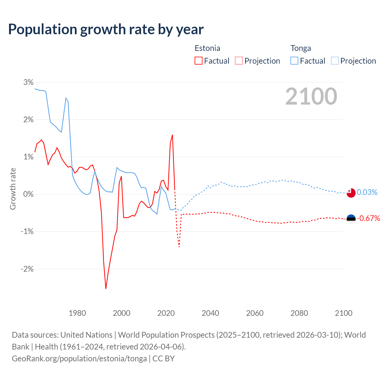 - For the last 10 years, Estonia has had an average growth rate of +0.37% per year vs -0.25% in Tonga.