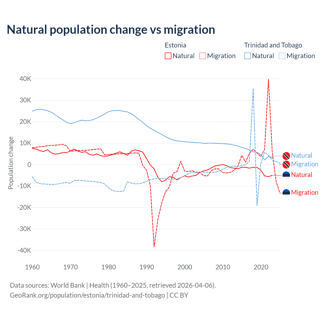 Over the last 10 years, 26.1% of the population change in Estonia is from natural causes (a loss of 27,683 people) and 73.9% is from migration (a gain of 78,553 people). In Trinidad and Tobago 66% is from natural causes (a gain of 55,887 people) and 34% is from migration (a gain of 28,785 people).