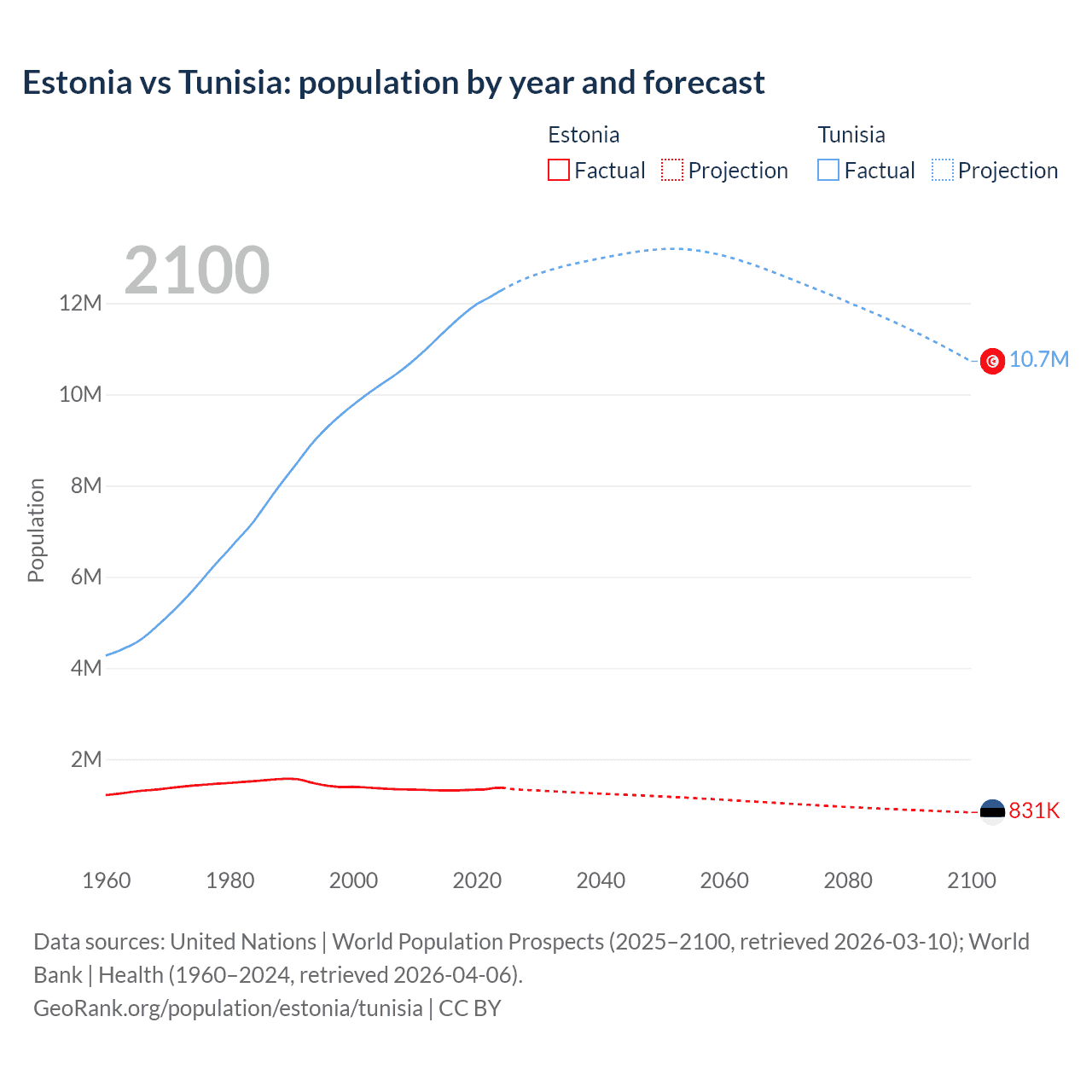 Estonia vs Tunisia: population by year and forecast
