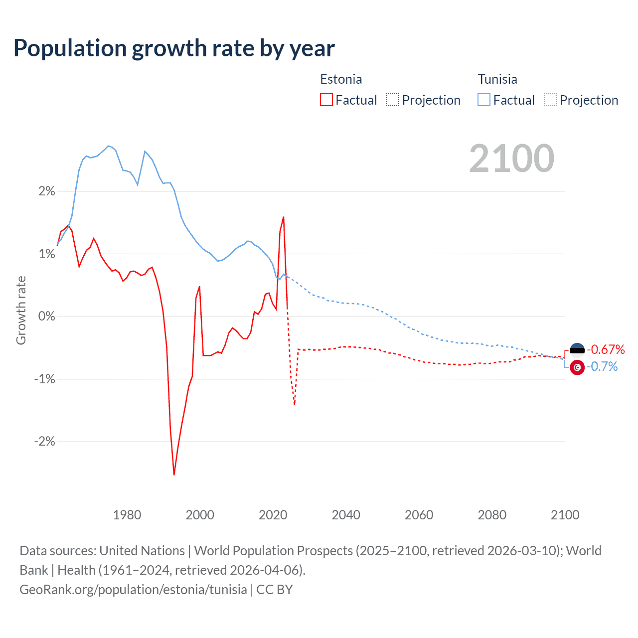 - For the last 10 years, Estonia has had an average growth rate of +0.37% per year vs +0.89% in Tunisia.