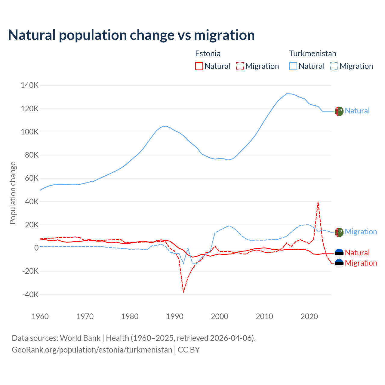 Over the last 10 years, 26.1% of the population change in Estonia is from natural causes (a loss of 27,683 people) and 73.9% is from migration (a gain of 78,553 people). In Turkmenistan 89.2% is from natural causes (a gain of 1,270,228 people) and 10.8% is from migration (a gain of 154,379 people).