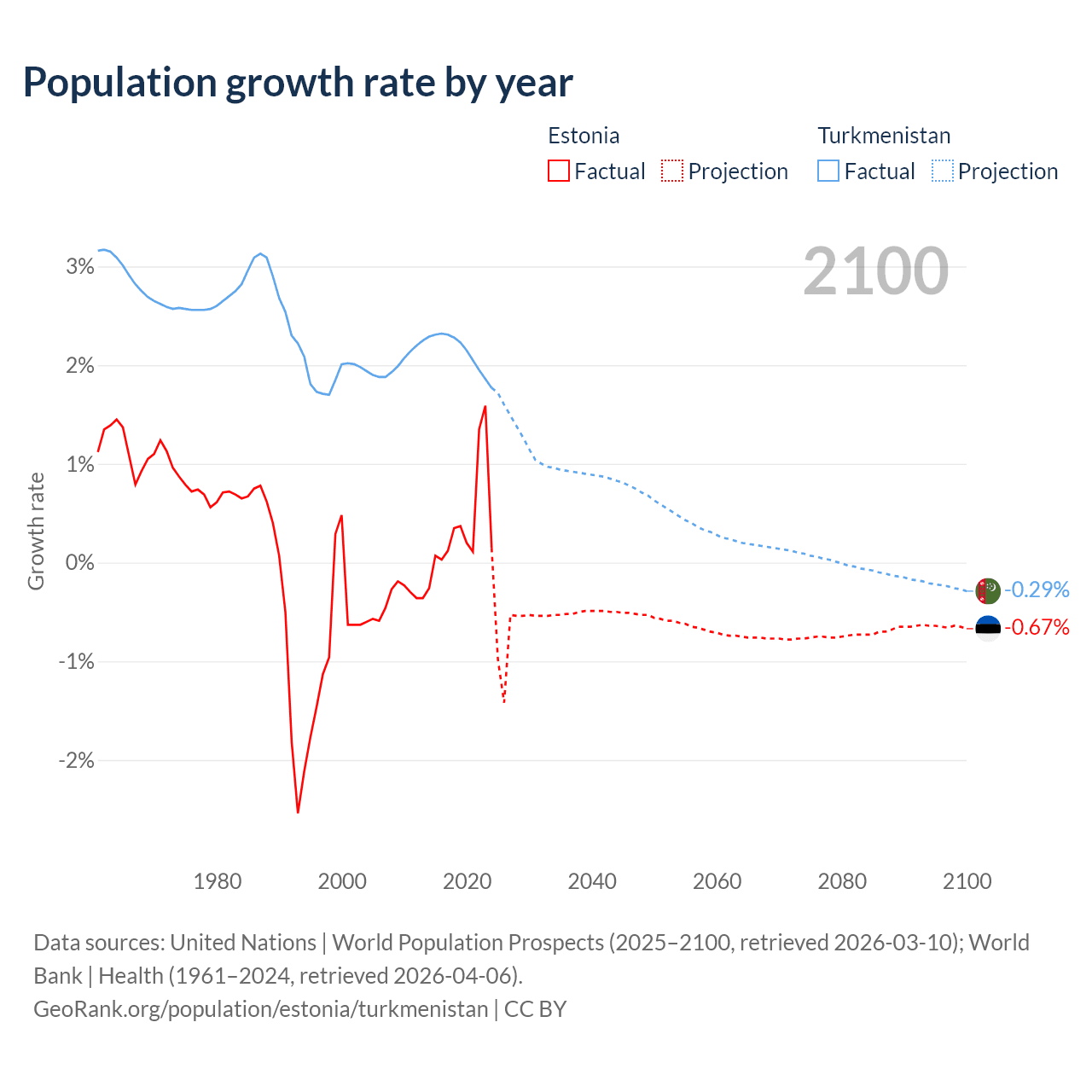 - For the last 10 years, Estonia has had an average growth rate of +0.37% per year vs +2.14% in Turkmenistan.