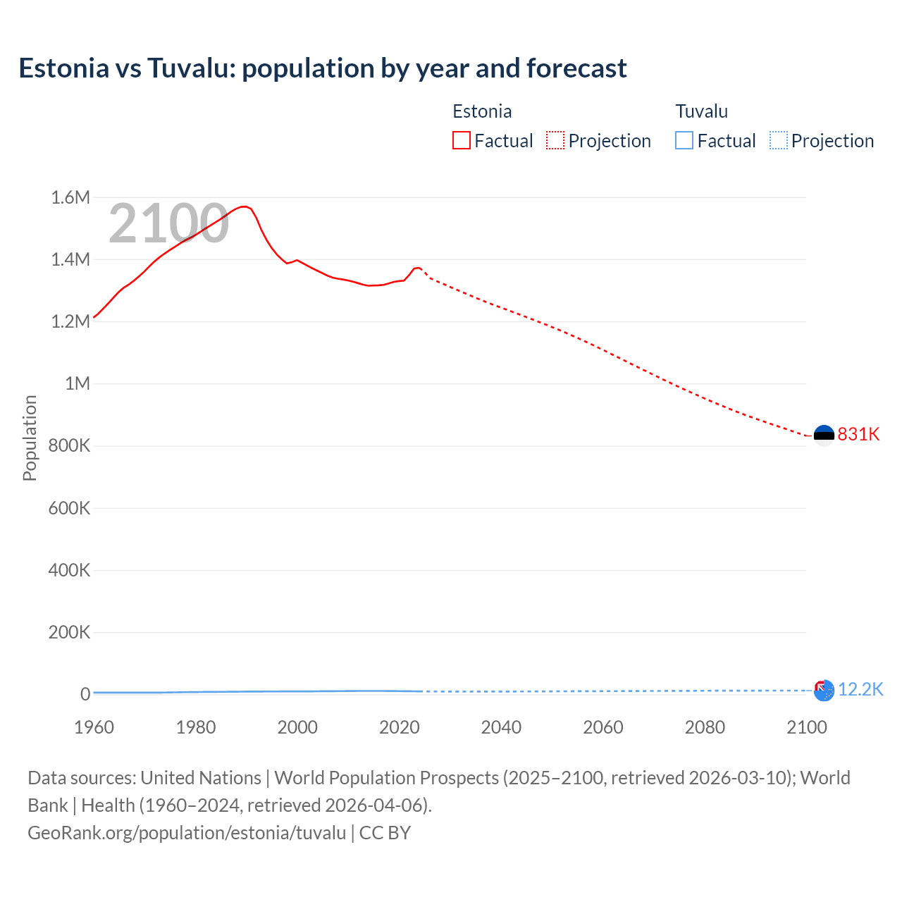 Estonia vs Tuvalu: population by year and forecast