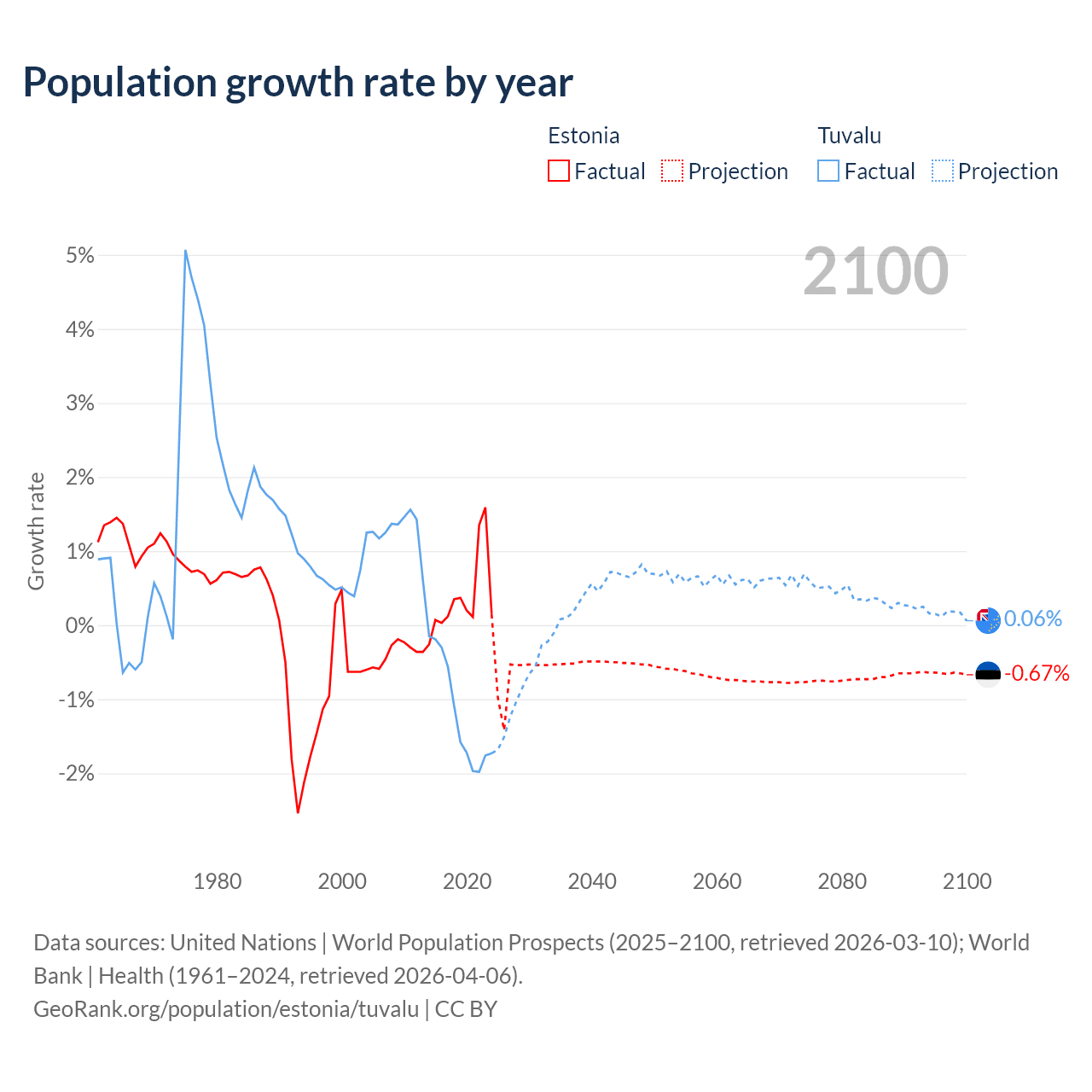 - For the last 10 years, Estonia has had an average growth rate of +0.37% per year vs -1.19% in Tuvalu.