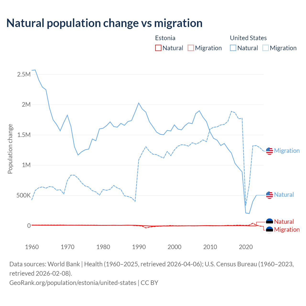 Over the last 10 years, 26.1% of the population change in Estonia is from natural causes (a loss of 27,683 people) and 73.9% is from migration (a gain of 78,553 people). In the United States 35.8% is from natural causes (a gain of 8,005,866 people) and 64.2% is from migration (a gain of 14,334,286 people).