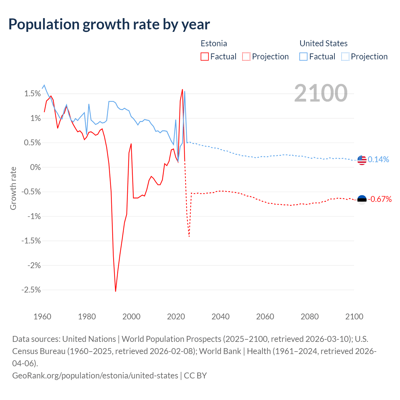 Data sources: World Bank | Health (1960–2024, retrieved 2026-04-06); United Nations | World Population Prospects (1960–2026, retrieved 2026-03-10); U.S. Census Bureau (1960–2025, retrieved 2026-02-08); Central Intelligence Agency (CIA) (2000–2019, retrieved 2026-02-20).