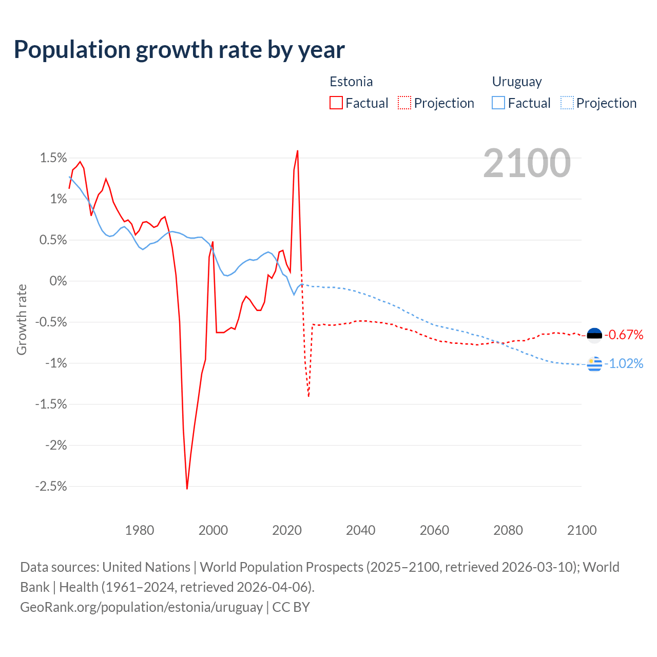 - For the last 10 years, Estonia has had an average growth rate of +0.37% per year vs +0.11% in Uruguay.