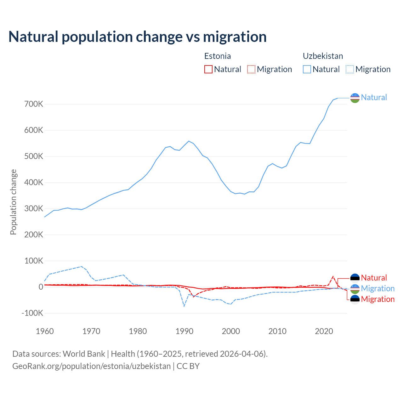 Over the last 10 years, 26.1% of the population change in Estonia is from natural causes (a loss of 27,683 people) and 73.9% is from migration (a gain of 78,553 people). In Uzbekistan 98.2% is from natural causes (a gain of 6,161,117 people) and 1.84% is from migration (a loss of 115,398 people).