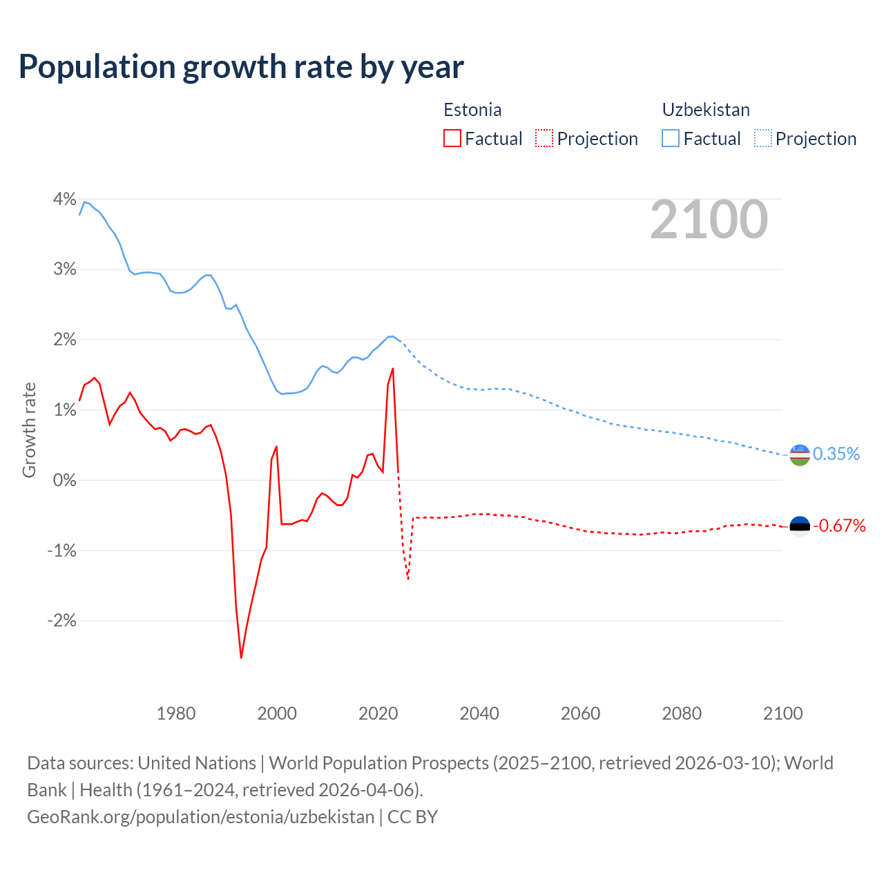 - For the last 10 years, Estonia has had an average growth rate of +0.37% per year vs +1.85% in Uzbekistan.