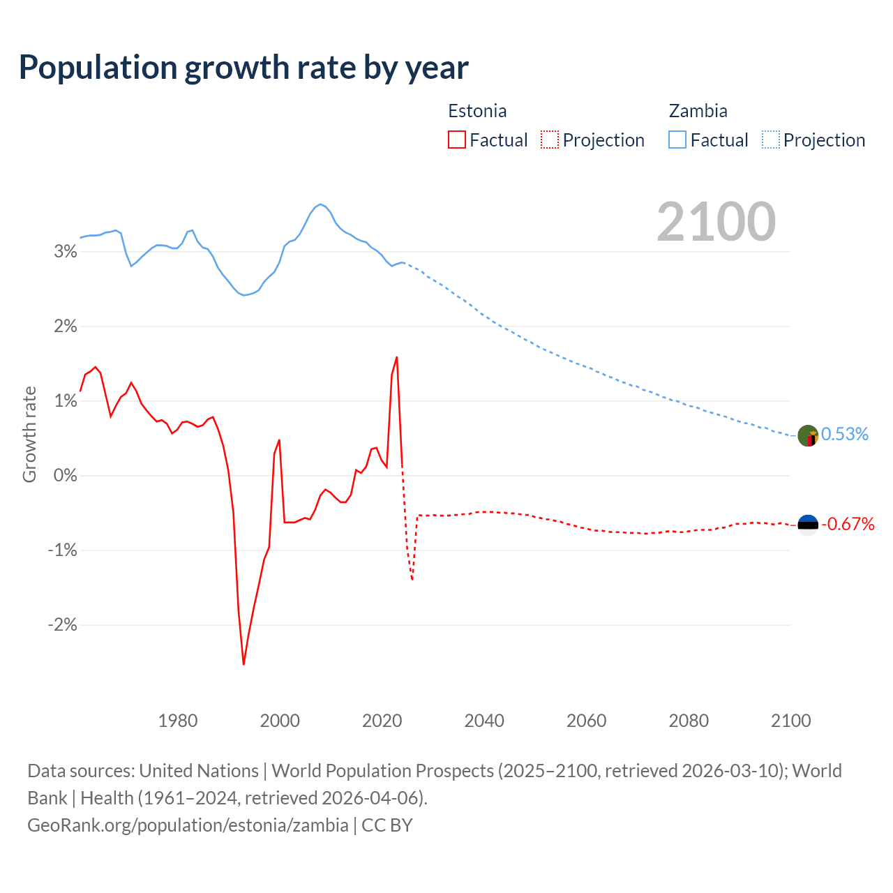 - For the last 10 years, Estonia has had an average growth rate of +0.37% per year vs +3% in Zambia.