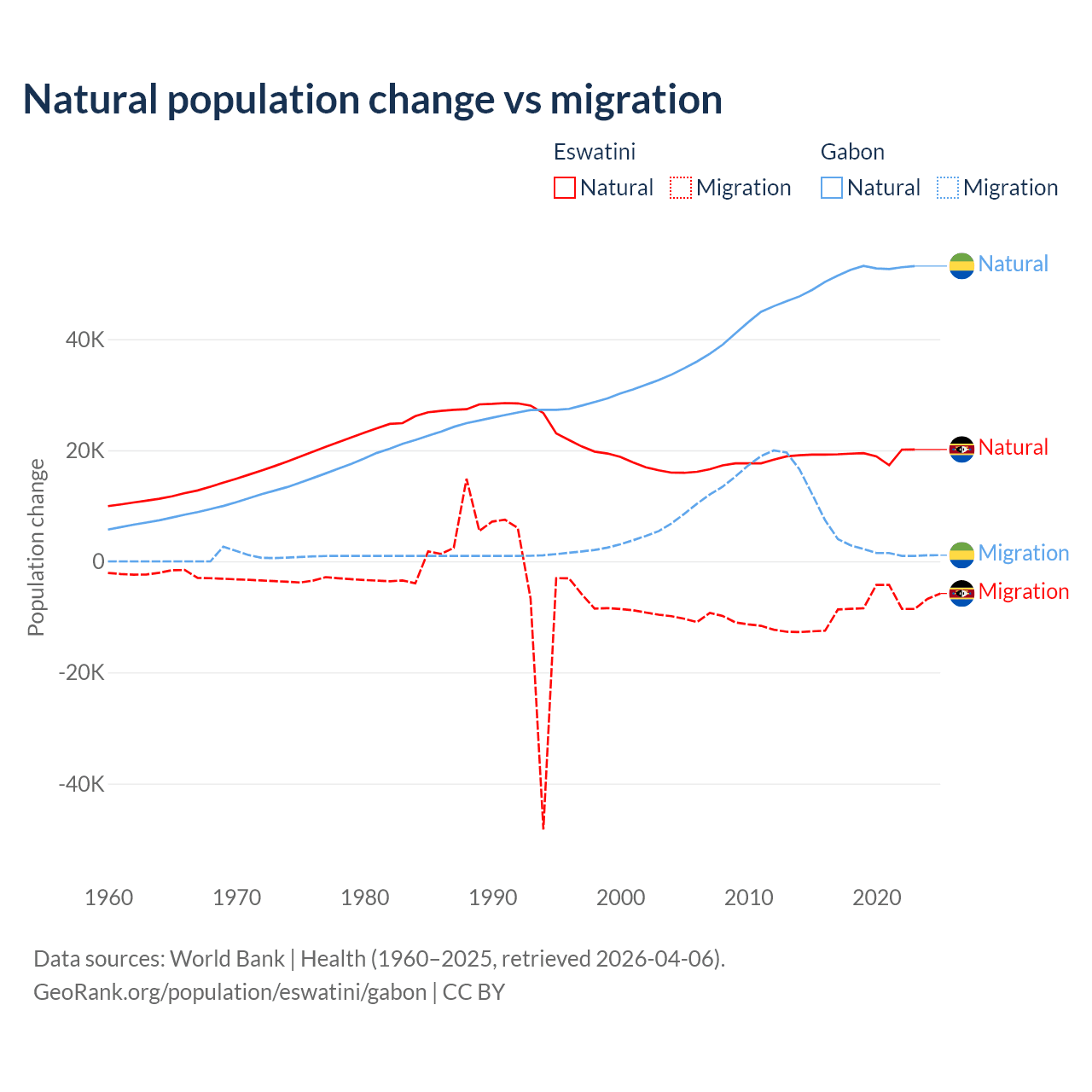 Over the last 10 years, 68.3% of the population change in Eswatini is from natural causes (a gain of 192,206 people) and 31.7% is from migration (a loss of 89,012 people). In Gabon 91.1% is from natural causes (a gain of 515,484 people) and 8.86% is from migration (a gain of 50,119 people).