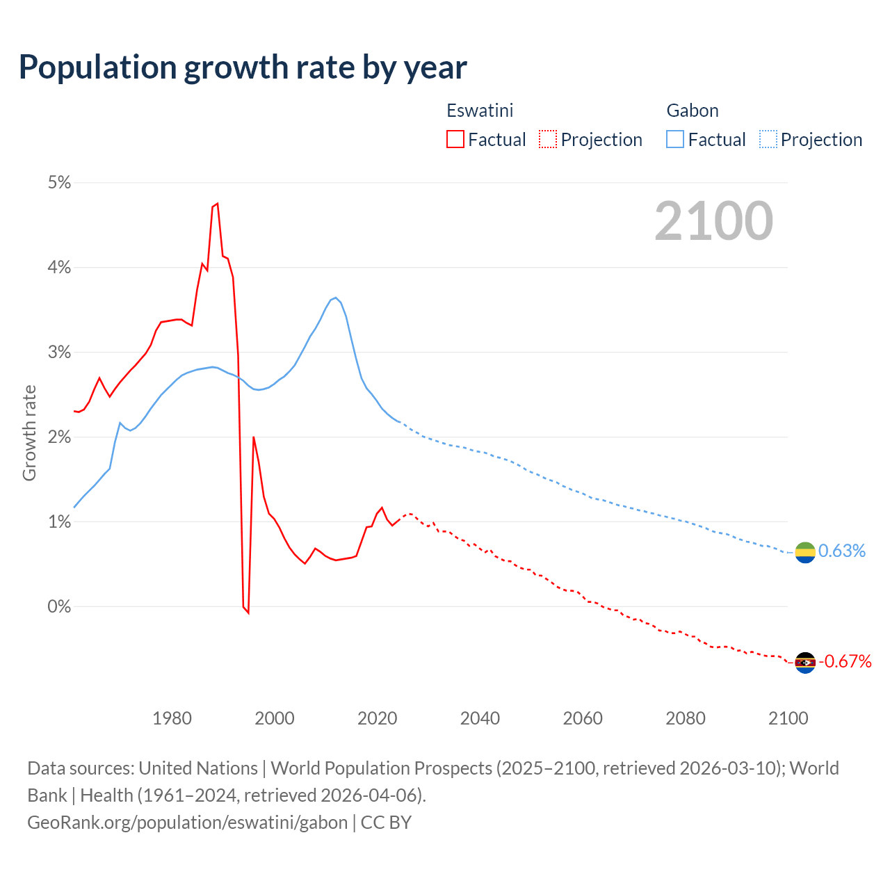 - For the last 10 years, Eswatini has had an average growth rate of +0.87% per year vs +2.61% in Gabon.