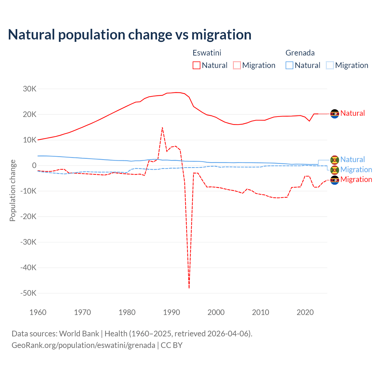 Over the last 10 years, 68.3% of the population change in Eswatini is from natural causes (a gain of 192,206 people) and 31.7% is from migration (a loss of 89,012 people). In Grenada 76% is from natural causes (a gain of 4,850 people) and 24% is from migration (a loss of 1,535 people).