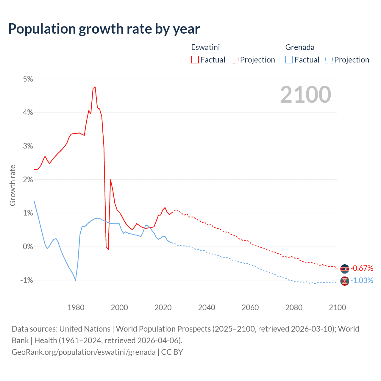 - For the last 10 years, Eswatini has had an average growth rate of +0.87% per year vs +0.29% in Grenada.