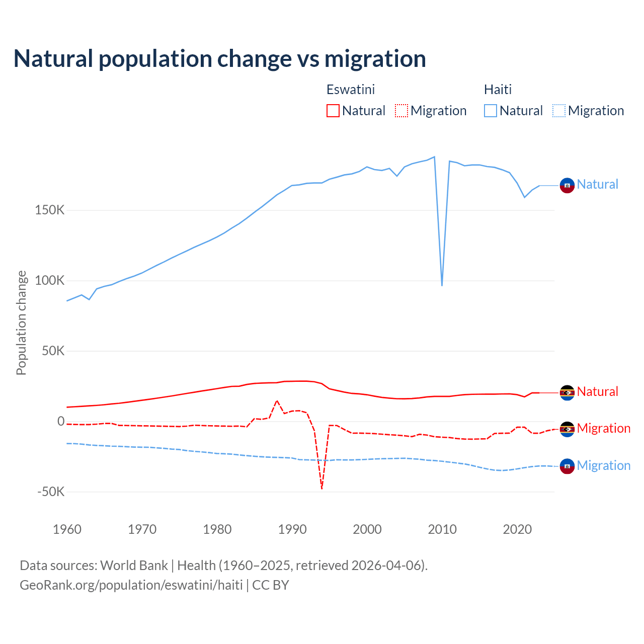 Over the last 10 years, 68.3% of the population change in Eswatini is from natural causes (a gain of 192,206 people) and 31.7% is from migration (a loss of 89,012 people). In Haiti 83.9% is from natural causes (a gain of 1,740,319 people) and 16.1% is from migration (a loss of 333,076 people).