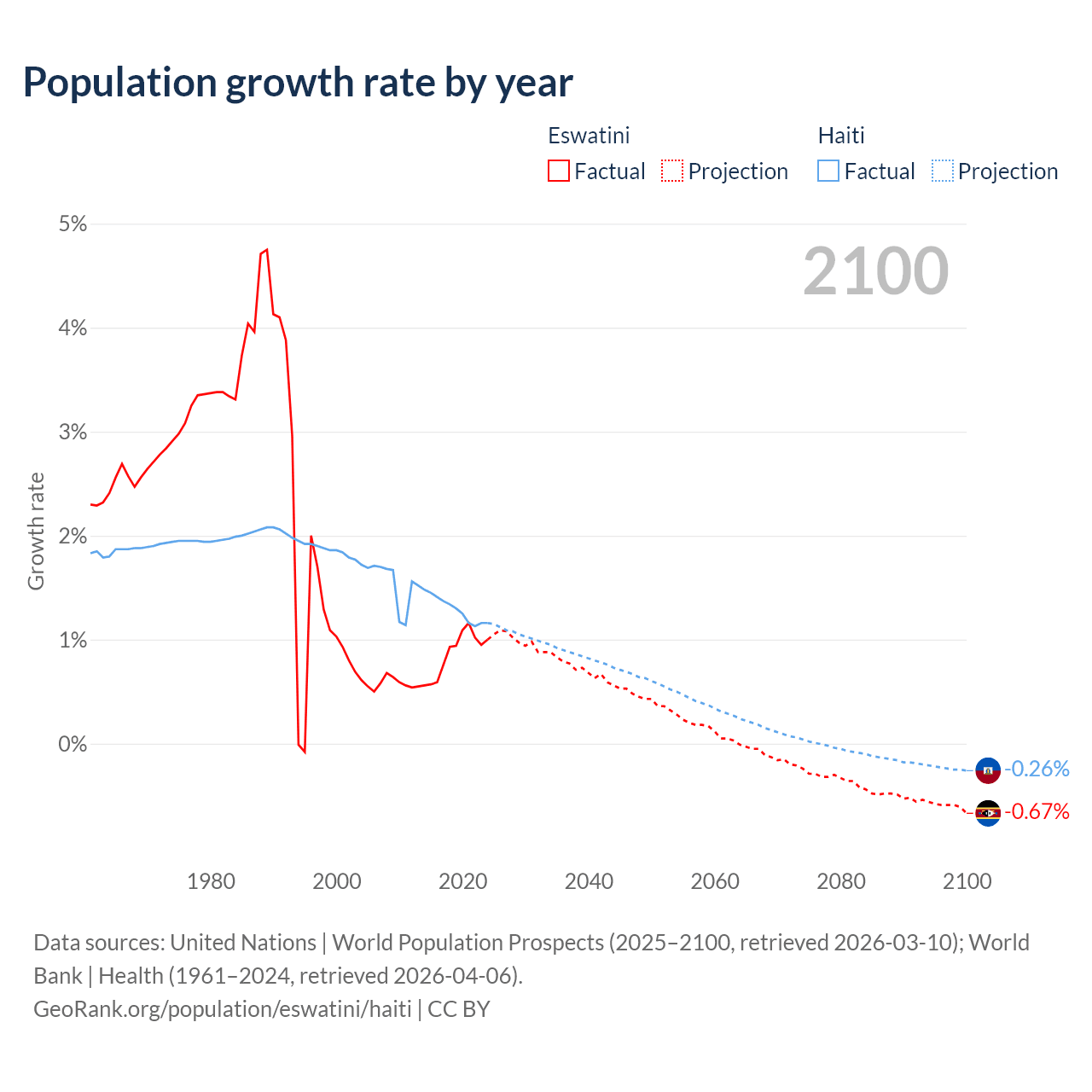 - For the last 10 years, Eswatini has had an average growth rate of +0.87% per year vs +1.29% in Haiti.