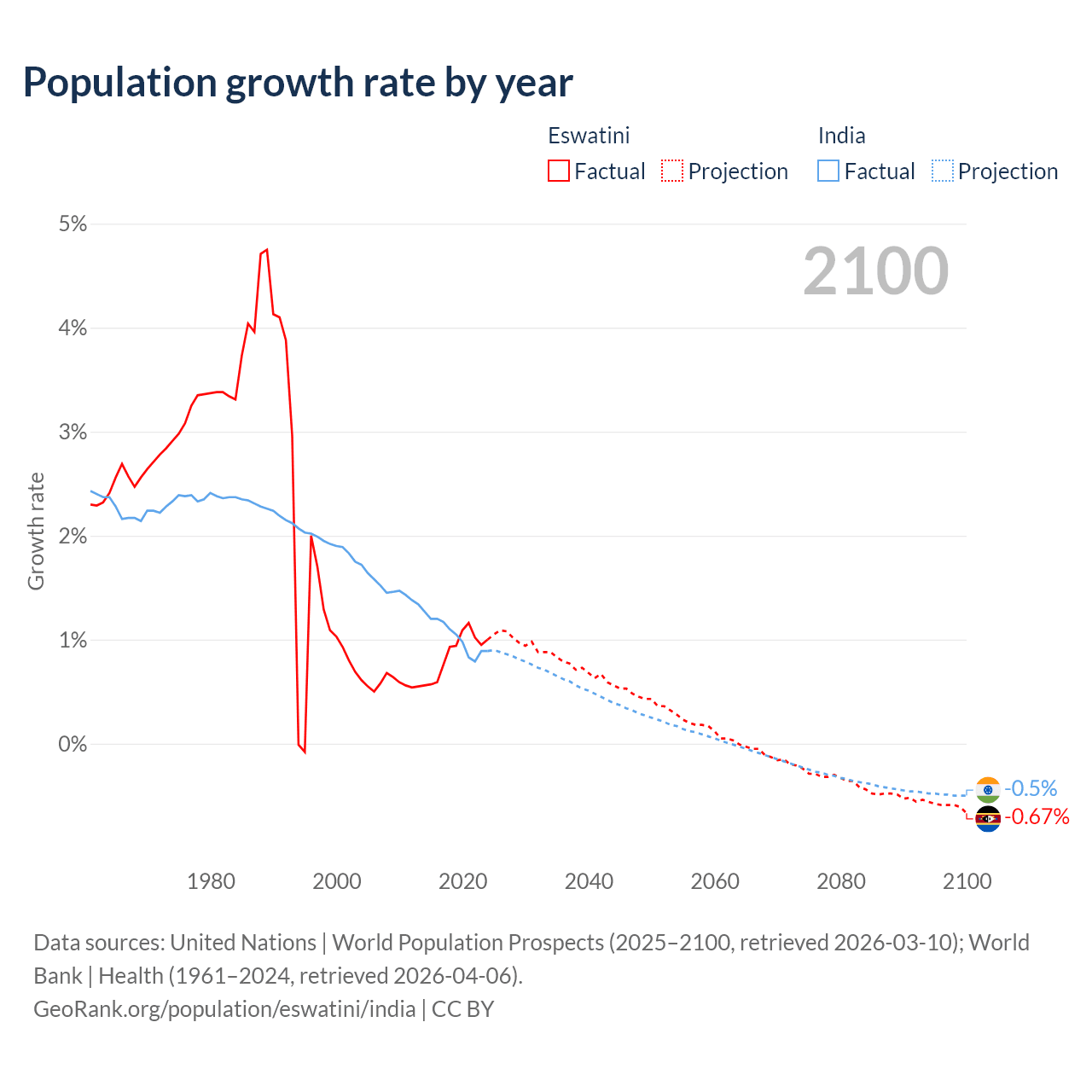 - For the last 10 years, Eswatini has had an average growth rate of +0.87% per year vs +1.03% in India.