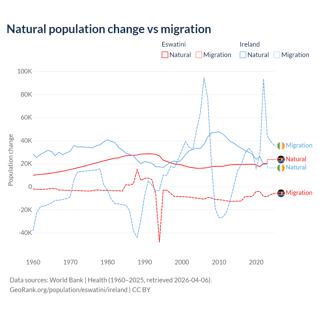 Over the last 10 years, 68.3% of the population change in Eswatini is from natural causes (a gain of 192,206 people) and 31.7% is from migration (a loss of 89,012 people). In Ireland 48.2% is from natural causes (a gain of 284,644 people) and 51.8% is from migration (a gain of 305,297 people).