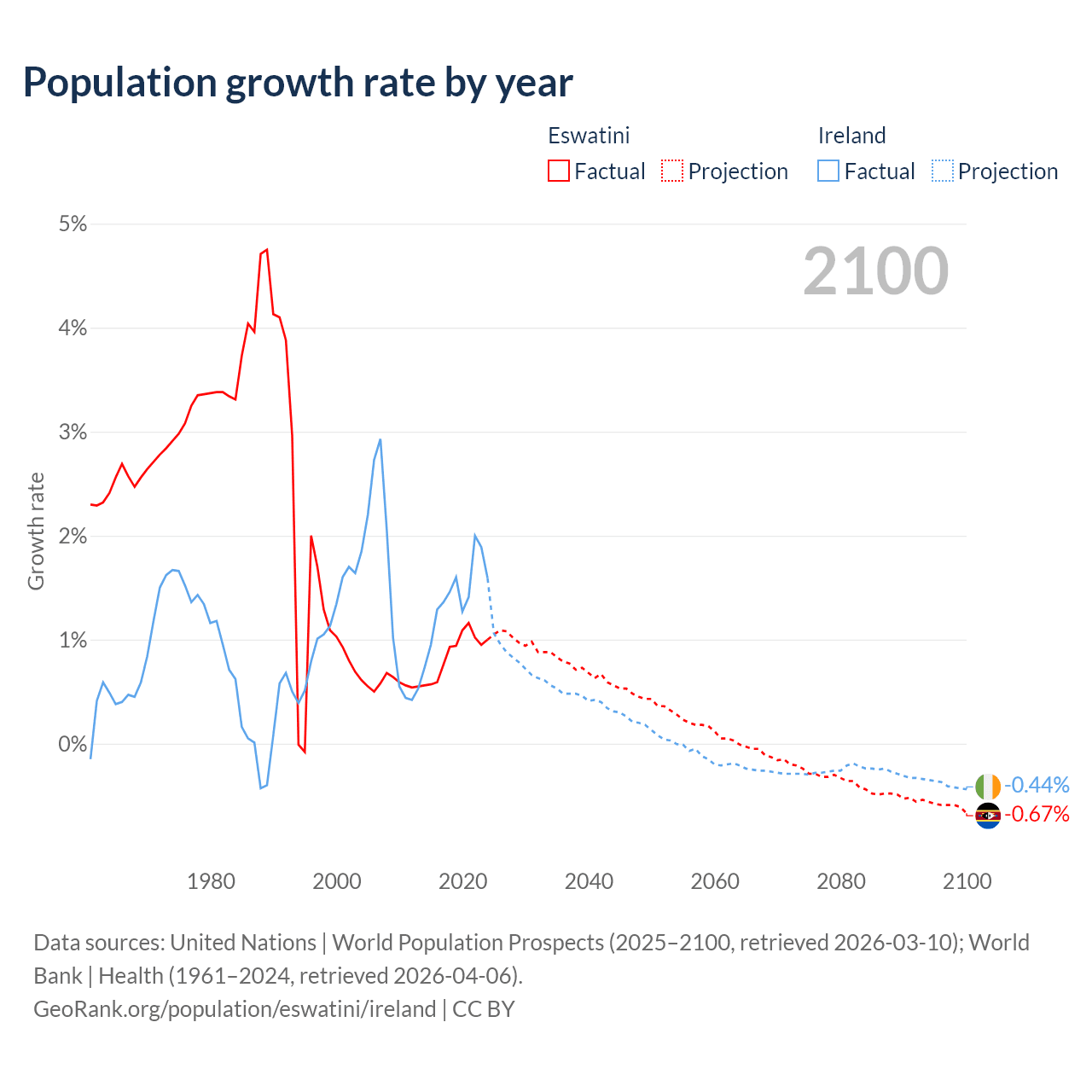 - For the last 10 years, Eswatini has had an average growth rate of +0.87% per year vs +1.41% in Ireland.