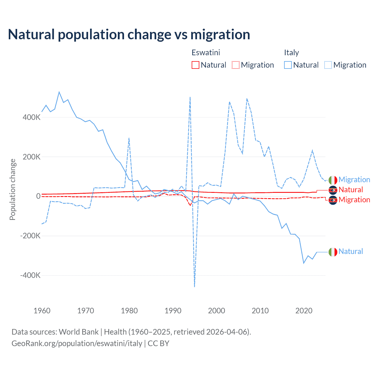 Over the last 10 years, 68.3% of the population change in Eswatini is from natural causes (a gain of 192,206 people) and 31.7% is from migration (a loss of 89,012 people). In Italy 68.6% is from natural causes (a loss of 2,239,084 people) and 31.4% is from migration (a gain of 1,026,128 people).