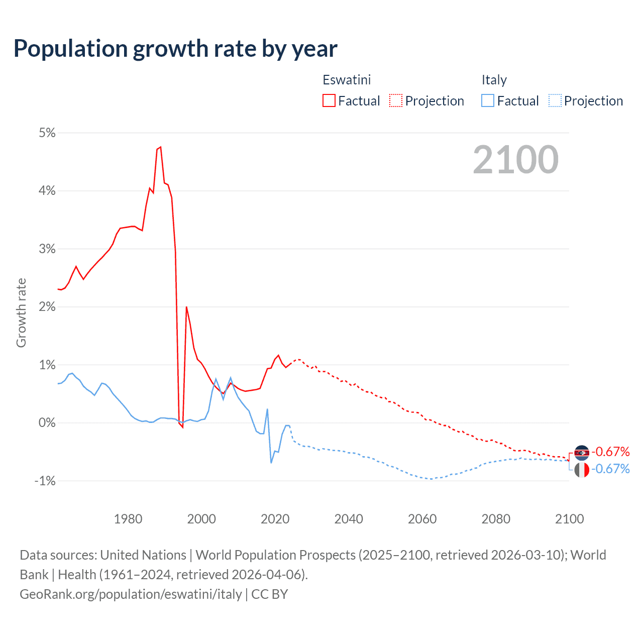 - For the last 10 years, Eswatini has had an average growth rate of +0.87% per year vs -0.21% in Italy.