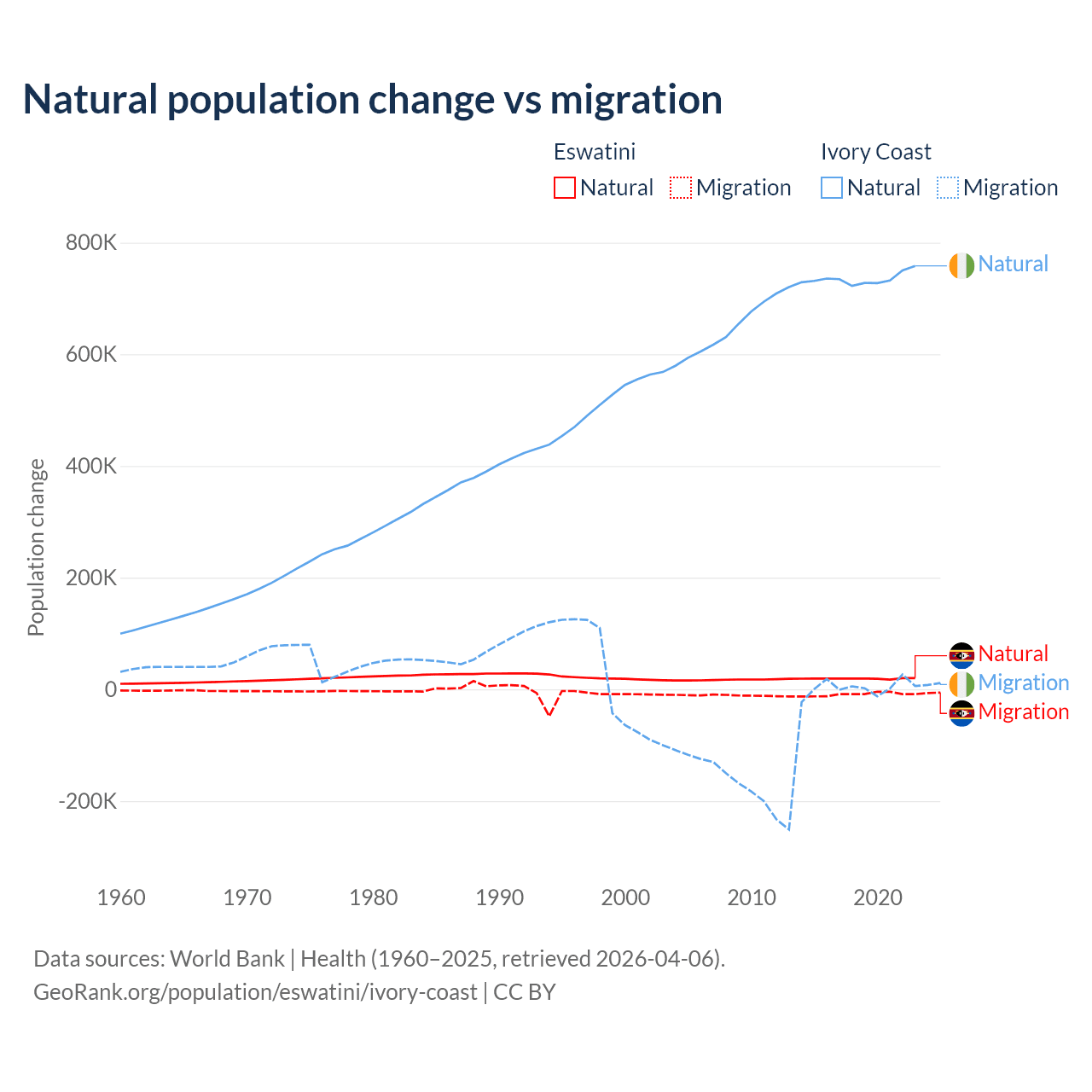 Over the last 10 years, 68.3% of the population change in Eswatini is from natural causes (a gain of 192,206 people) and 31.7% is from migration (a loss of 89,012 people). In Ivory Coast 99.7% is from natural causes (a gain of 7,348,944 people) and 0.33% is from migration (a gain of 24,432 people).
