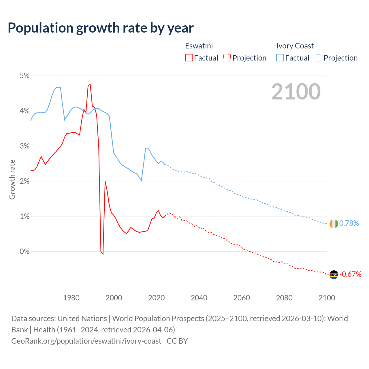 - For the last 10 years, Eswatini has had an average growth rate of +0.87% per year vs +2.65% in Ivory Coast.