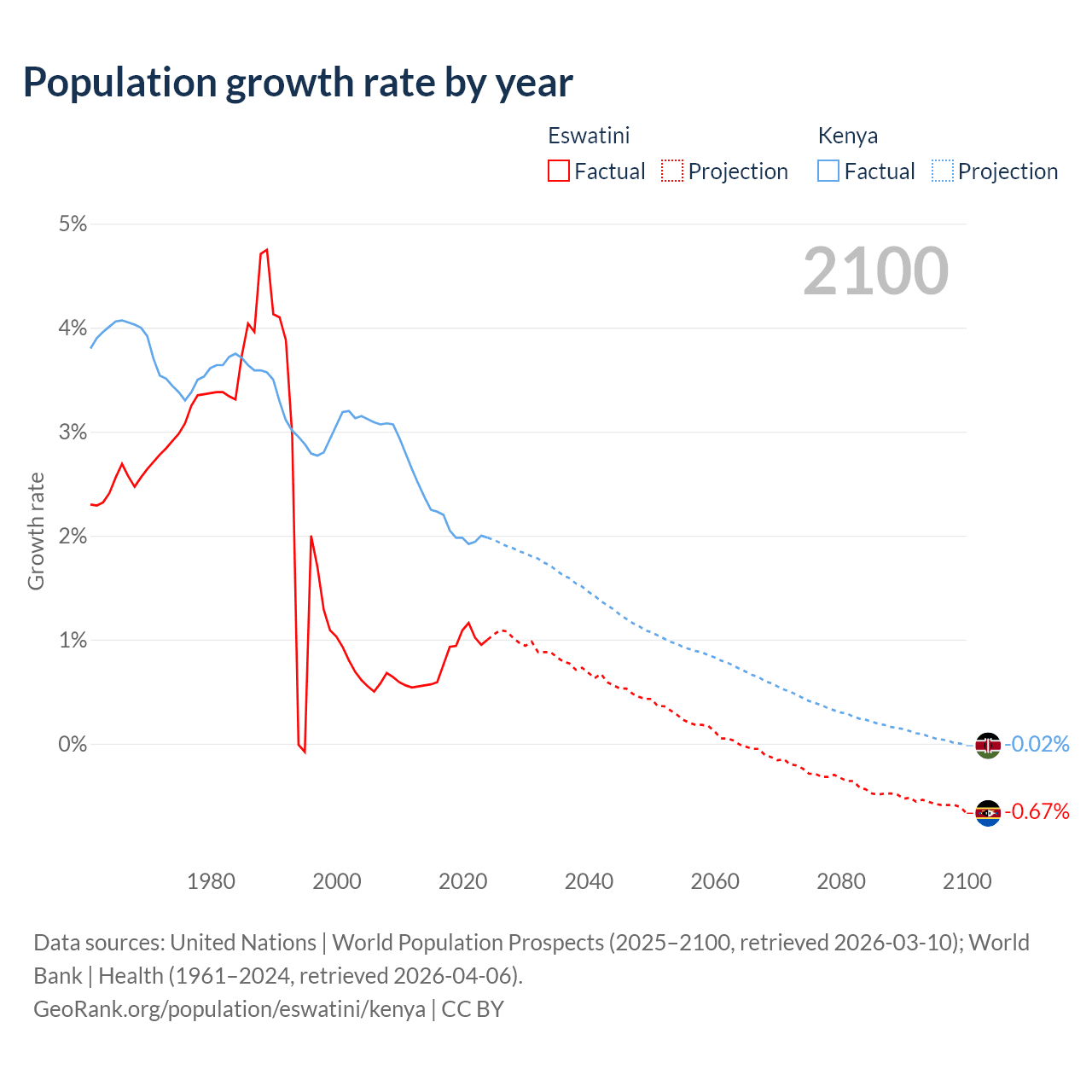 - For the last 10 years, Eswatini has had an average growth rate of +0.87% per year vs +2.08% in Kenya.