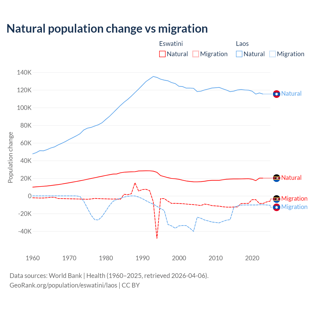 Over the last 10 years, 68.3% of the population change in Eswatini is from natural causes (a gain of 192,206 people) and 31.7% is from migration (a loss of 89,012 people). In Laos 90.6% is from natural causes (a gain of 1,183,013 people) and 9.41% is from migration (a loss of 122,899 people).