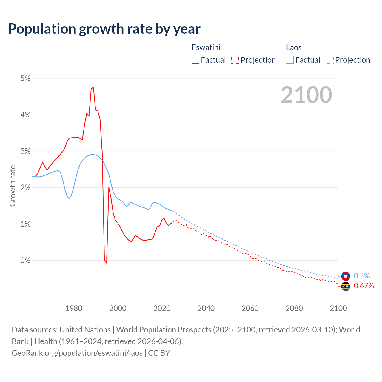 - For the last 10 years, Eswatini has had an average growth rate of +0.87% per year vs +1.48% in Laos.