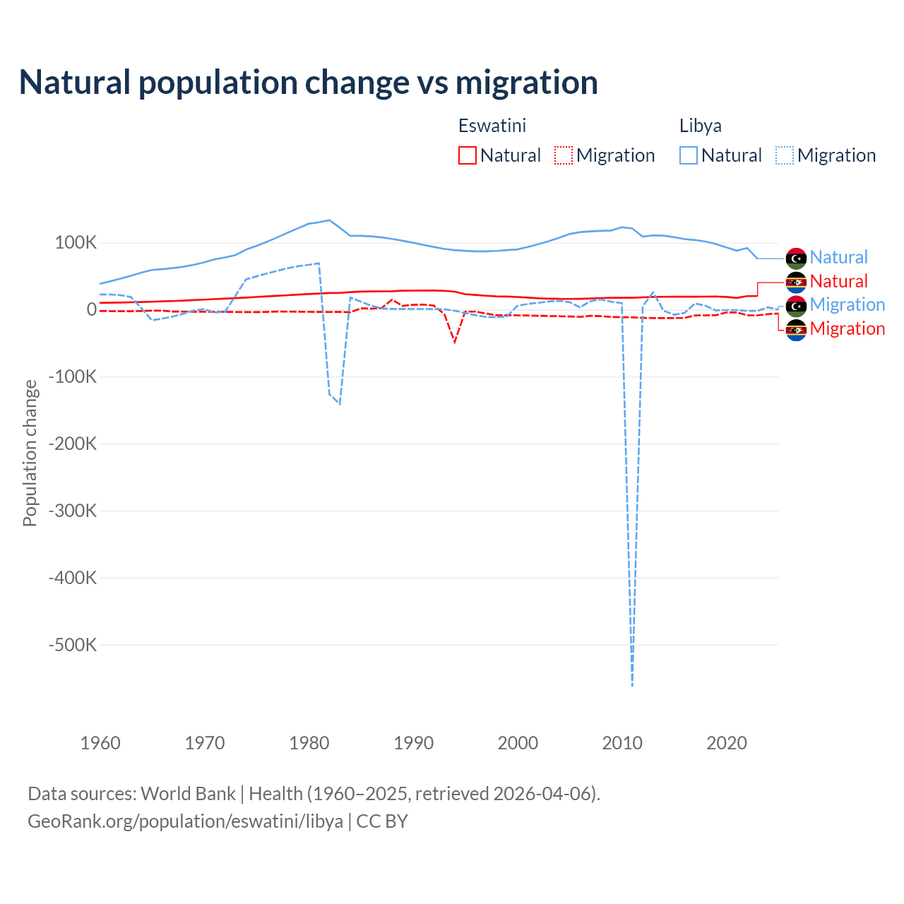 Over the last 10 years, 68.3% of the population change in Eswatini is from natural causes (a gain of 192,206 people) and 31.7% is from migration (a loss of 89,012 people). In Libya 99.4% is from natural causes (a gain of 975,799 people) and 0.63% is from migration (a loss of 6,150 people).