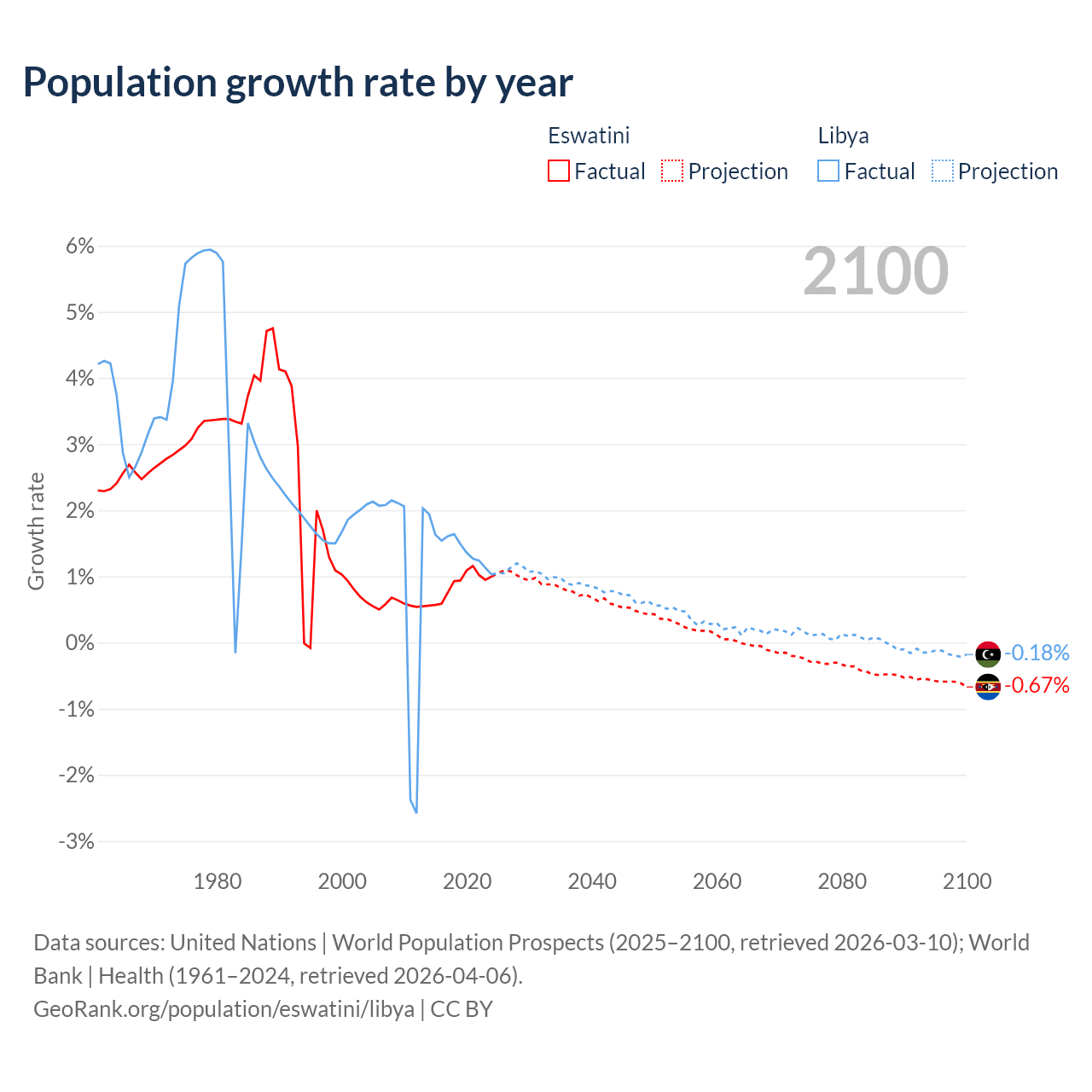 - For the last 10 years, Eswatini has had an average growth rate of +0.87% per year vs +1.44% in Libya.