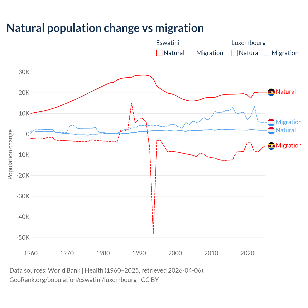 Over the last 10 years, 68.3% of the population change in Eswatini is from natural causes (a gain of 192,206 people) and 31.7% is from migration (a loss of 89,012 people). In Luxembourg 16.8% is from natural causes (a gain of 20,287 people) and 83.2% is from migration (a gain of 100,435 people).
