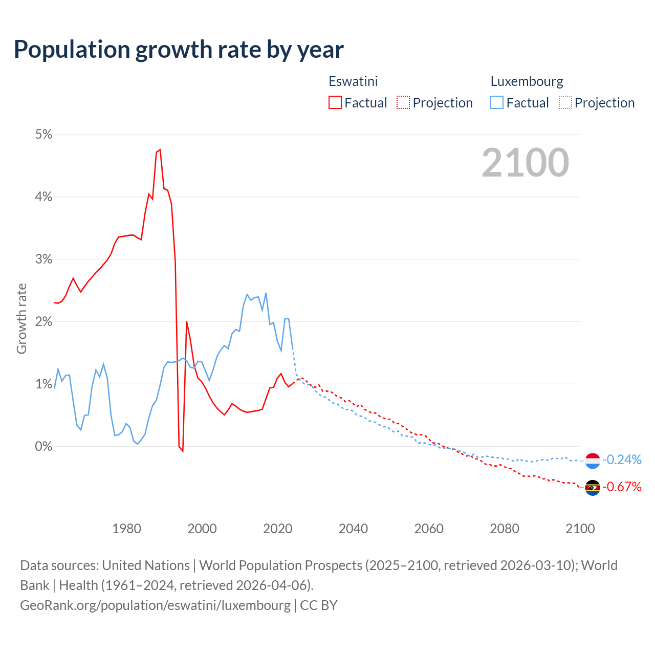 - For the last 10 years, Eswatini has had an average growth rate of +0.87% per year vs +2.02% in Luxembourg.