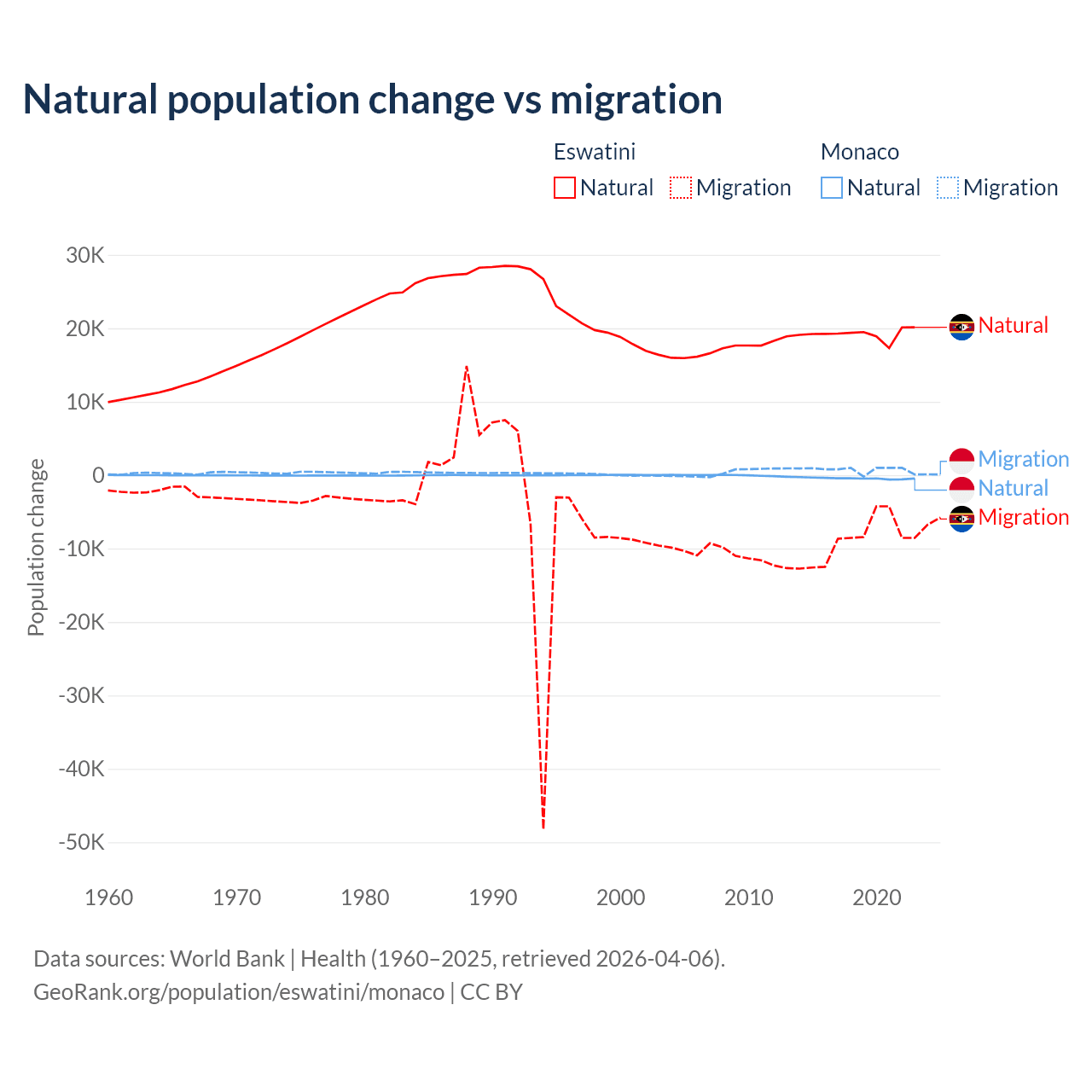 Over the last 10 years, 68.3% of the population change in Eswatini is from natural causes (a gain of 192,206 people) and 31.7% is from migration (a loss of 89,012 people). In Monaco 37.3% is from natural causes (a loss of 4,357 people) and 62.7% is from migration (a gain of 7,333 people).