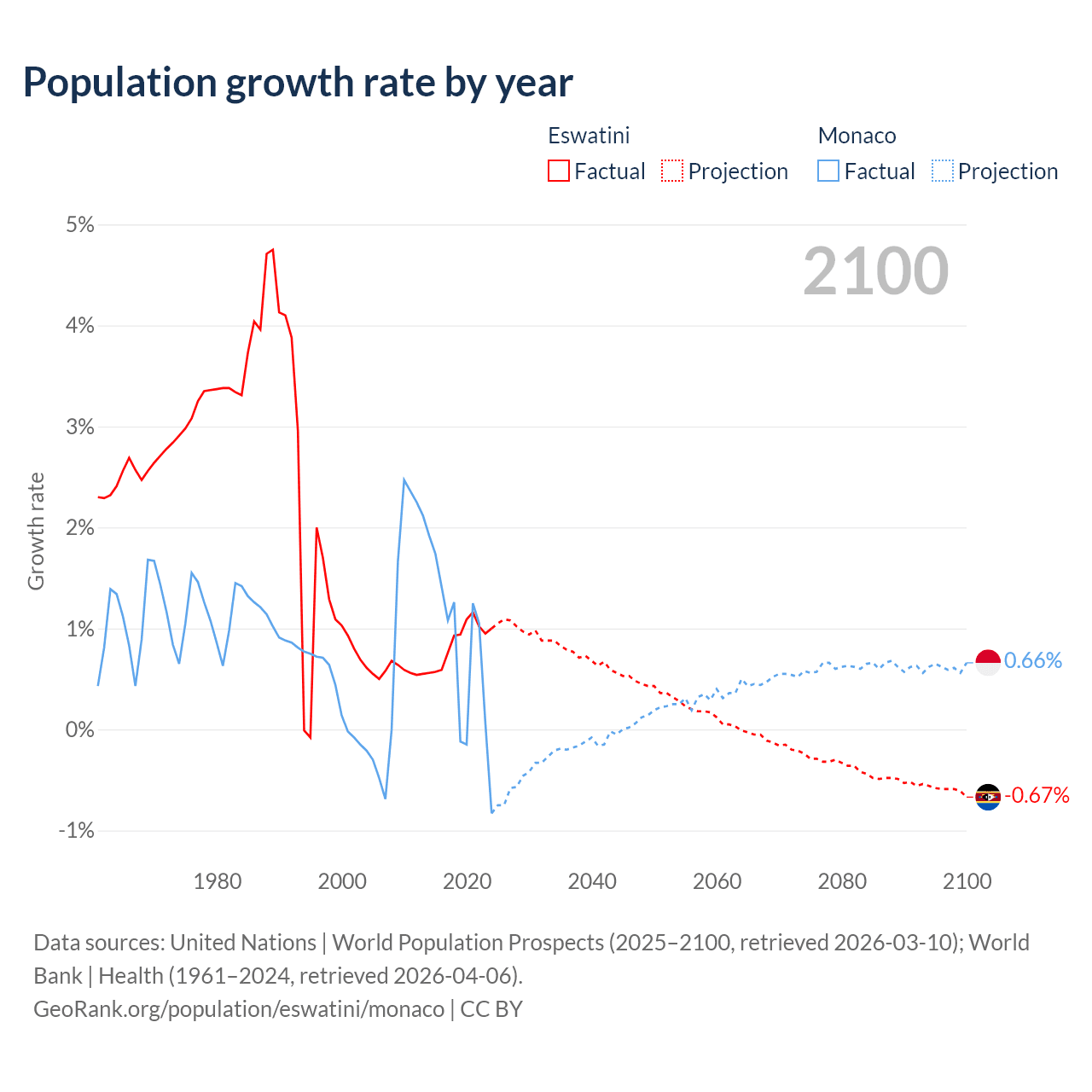- For the last 10 years, Eswatini has had an average growth rate of +0.87% per year vs +0.79% in Monaco.