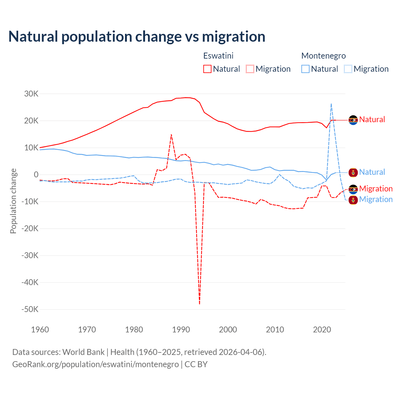 Over the last 10 years, 68.3% of the population change in Eswatini is from natural causes (a gain of 192,206 people) and 31.7% is from migration (a loss of 89,012 people). In Montenegro 52.4% is from natural causes (a gain of 4,501 people) and 47.6% is from migration (a gain of 4,095 people).